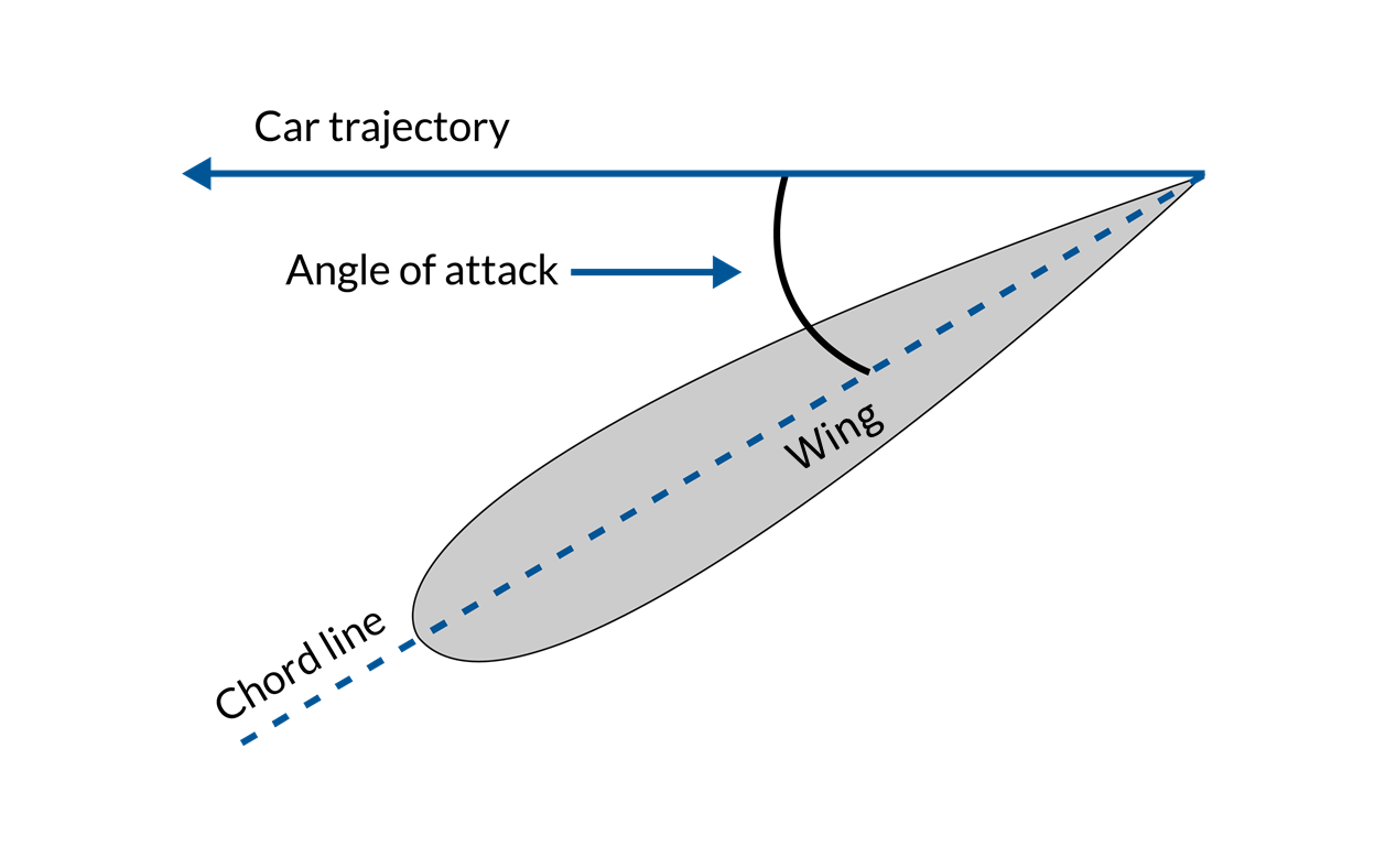 A schematic depicting the angle of attack of a wing with the car trajectory, angle of attack, chord line, and wing labeled. The angle of attack of a wing, which plays a crucial role in determining the drag generated by it.