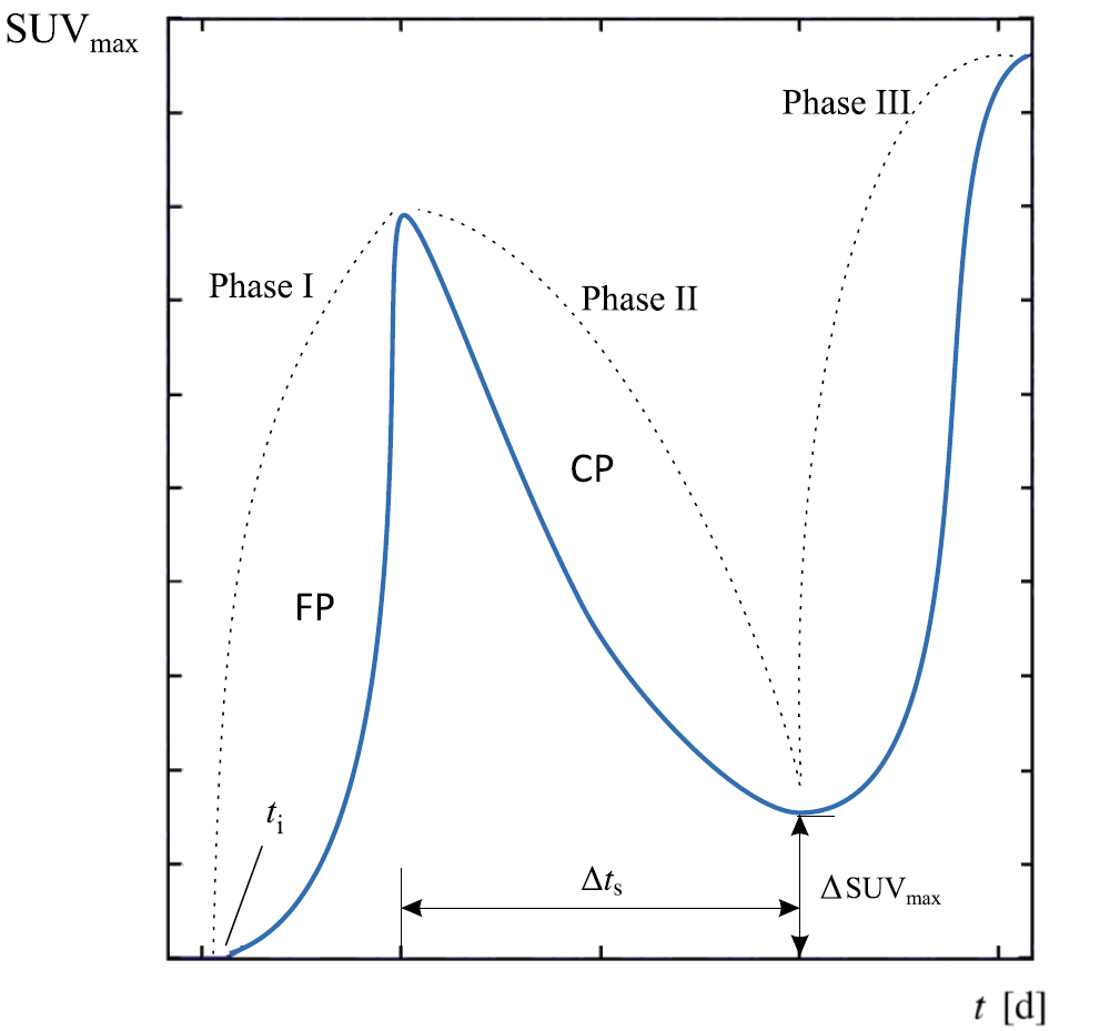 Phase I (free proliferation), begins at an unknown starting point (ti) and continues until the diagnosis for the tumor is made (t = 0). At this point, a diagnostic image is performed and an oncologist will determine which therapy the patient needs. Following this, Phase II (challenged proliferation) represents the start of therapy and observes the partial regression of the tumor due to therapeutic intervention. Lastly, Phase III (uncontrolled growth) is an observation period to see if there is further tumor growth or an increase in metabolic activity after treatment has ended or resistance develops. This phase helps to highlight if further monitoring and additional treatments are needed. The validated mathematical model was integrated into CancerMate, where rc and ϵPD are the two primary virtual biomarkers.